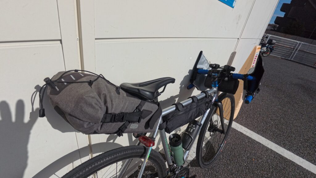 荷物はサドルバッグ、フレームバッグ、ハンドルバッグで全てR250のアイテムで収納。展示会の水曜日は名古屋で一泊して、木曜日は寒波がやって来るらしいので防寒具など荷物はやや多めになる。