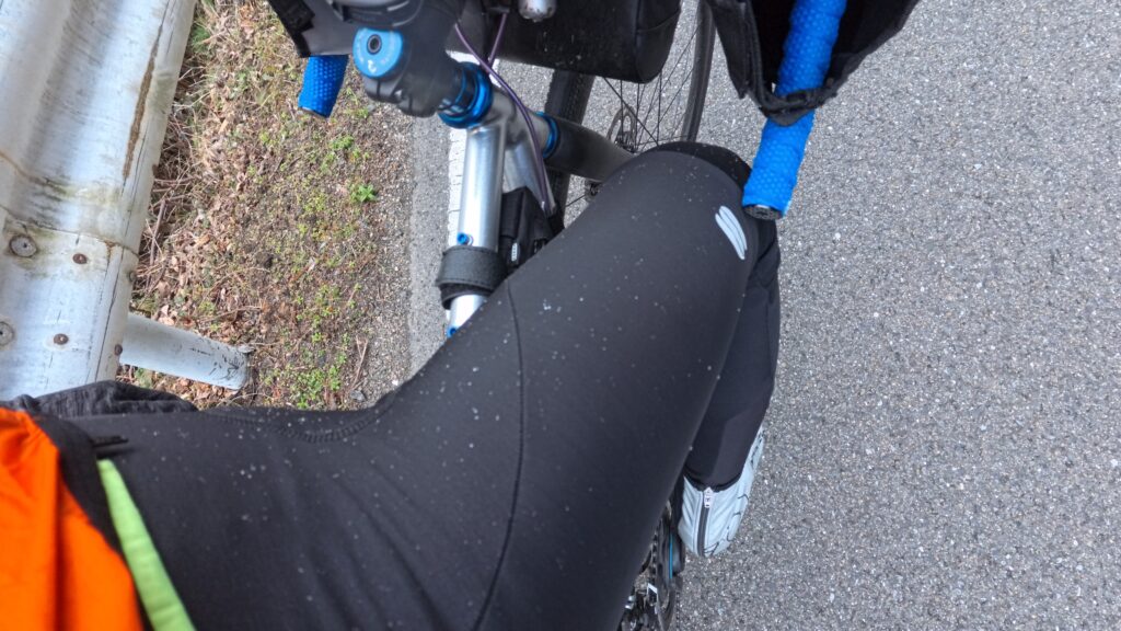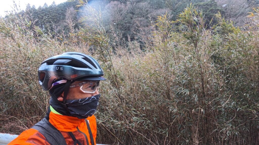 問題の帰路は8時にホテルを出発するも、西風が強くてなかなか進まないばかりか、日差しもなくて気温が上がらない。伊賀方面に出るころには結構な勢いで雪が降ってきた。万が一の雨雪に備えて防水のタイツを選んで正解だった。