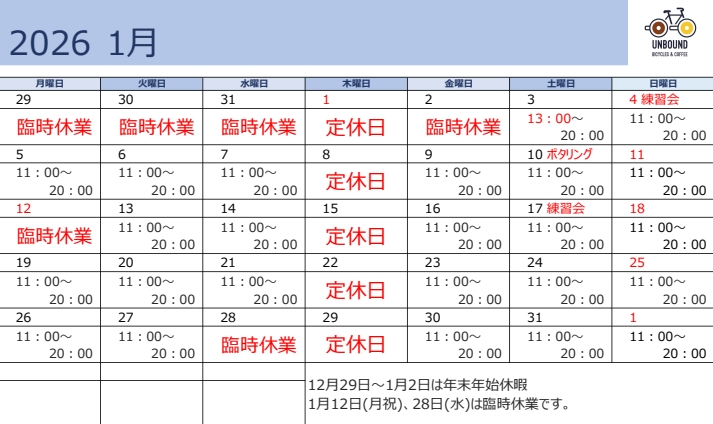 2026年1月は3日から通常営業を再開しています。イベントや特別な予定がない営業日は11時~20時、作業は事前にご予約いただけると幸いです。