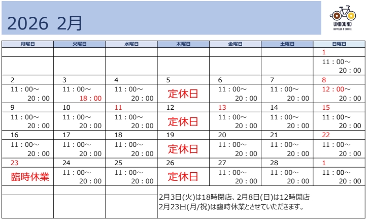 2月のアンバウンドですが、23日(月/祝)は臨時休業とさせていただきます。また、2月8日(日)は11時から店内貸し切りのご予約があり、通常営業は12時30分からとなります。