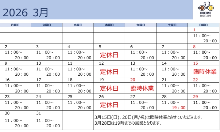 3月のアンバウンドですが、15日(日)および20日(金/祝)は臨時休業とさせていただきます。また、3月28日(土)は所用により19時で閉店とさせていただきます。
